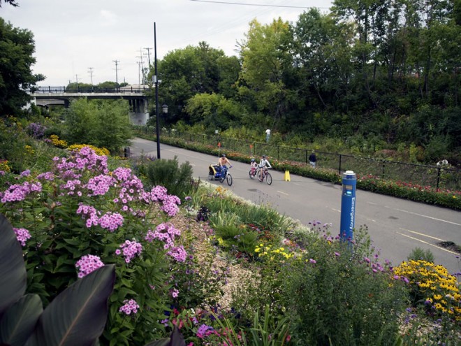 Offering barrier-free bicycling and walking for those making cross-town trips, the Midtown Greenway is a 5.5 mile bicycling and walking trail located in what was once an underutilized space on a former railroad corridor. Including several community gardens, pocket parks, seating, public art, murals, wayfinding, and year round events, the Midtown Greenway is more than just a bicycling and walking path; it is a space for relaxing in gardens, viewing art, and participating in community events.