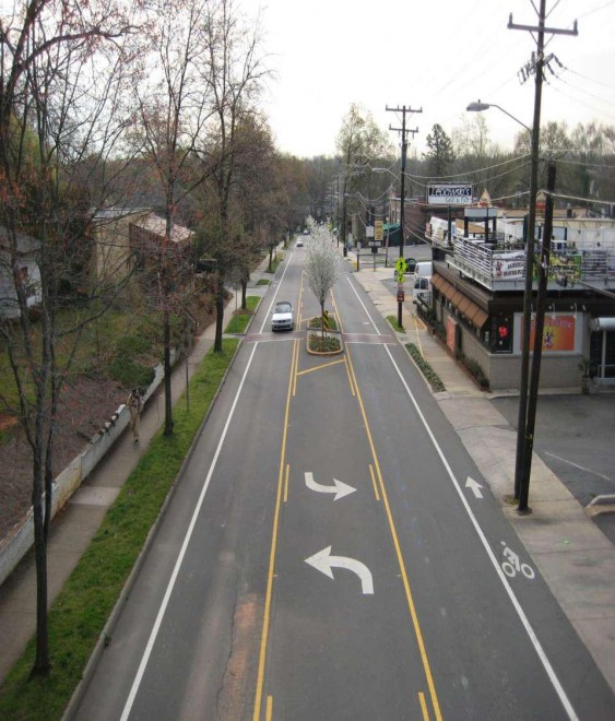 Beginning in 2006, Charlotte's East Boulevard - an arterial street with approximately 16,000 to 21,400 daily motorized vehicle traffic - began a process of rightsizing in order to reduce high travel speeds and make the area more pedestrian friendly. The street was converted from 5 vehicle lanes to 3, which made it possible to create additional bicycle and pedestrian space, including adding 12 mid-block pedestrian refuge islands and bike lanes. After the redesign, 85% of vehicle speeds declined from 43 to 40 miles per hour. Prior to the changes, some vehicles traveled at excessive speeds of 50-60 miles per hour on this 35 mile per hour road.