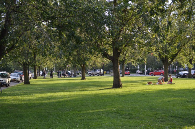 Elmwood Village’s gorgeous tree-lined grass medians function not only as a traffic calming tool, but they also add important public space to the neighborhood. The median reduces the amount of pavement space that is available to cars, while the trees lining the roadway also help to slow vehicle speeds. In occupying these medians, residents turn them into public spaces for picnicking, playing hacky sack, and relaxing. On weekends, the medians are packed with people who have come to enjoy the Elmwood Bidwell Farmers Market as well as live entertainment and events.
