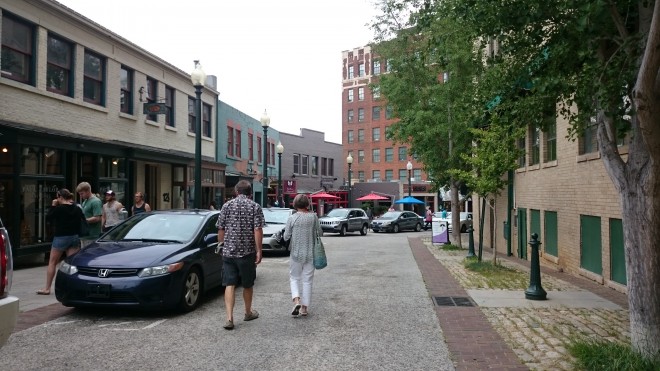 Designed as a "shared street" to maximize space for pedestrians in a narrow right-of-way, Wall Street is home to several businesses, coffee shops, and restaurants. Though there are sidewalks, many people spill out to walk into the street, since the sidewalk and street are at grade level (which also helps to slow driving speeds).