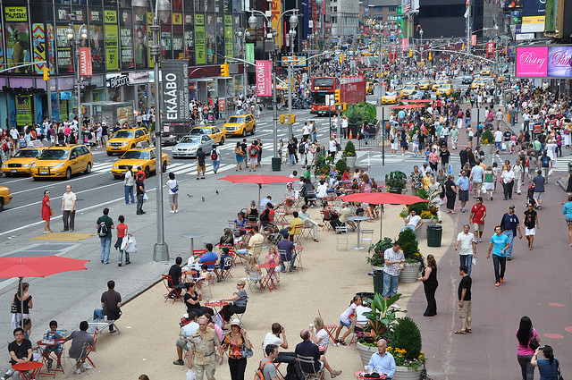 Despite being a top tourist destination, narrow sidewalks and vehicular congestion previously made Broadway an unpleasant or unsafe place to be. In 2009, 2.3 miles of Broadway Avenue were redesigned, which included removing traffic lanes, limiting turns, widening sidewalks, and adding separated bike lanes, pedestrian plazas and promenades. The result is a street with improved traffic flows and a safer and more welcoming experience for pedestrians.
