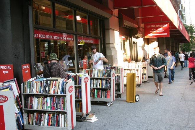 On East 12th Street between 4th Avenue and Broadway Avenue lies Strand Bookstore, a New York literary landmark. Numerous carts holding discount books line the sidewalk and invite passersby to become bookstore browsers. With these outdoor book bins, Strand Bookstore creates an inviting sidewalk environment that brings the store outdoors and encourages lingering on the sidewalk.