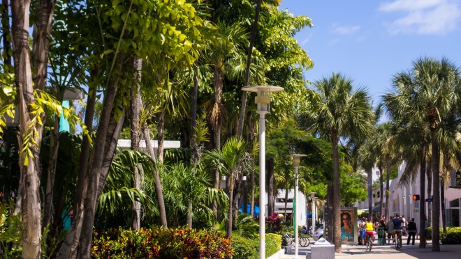 South Beach’s Lincoln Road Mall, a pedestrian street, is filled with outdoor cafés and shopping along with numerous fountains and ponds which attract hundreds of visitors daily. Unique landscaping and awnings provide shade from the hot Florida sun, inviting passersby to relax and linger. The colors and style used in its design, its palm trees and plants, and expansive indoor/outdoor restaurants all contribute to the area's unique local flavor.