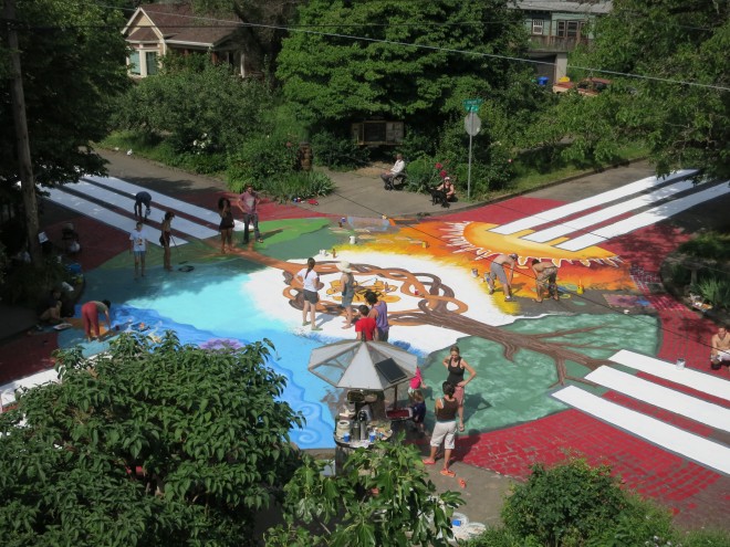 Residents of Portland’s Sellwood Neighborhood transformed a residential intersection into an interactive social gathering place for people. Each corner of this colorful intersection includes a unique amenity such as a community bulletin board, a little free library, a 24-hour tea stand, and an open air playhouse for children. Today, this intersection is a community-oriented space for both neighbors and visitors.