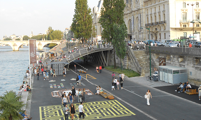In 2013, the City of Paris transformed one of its busiest two-lane thoroughfares in the city, Voies sur Berges, into a 1.4 mile pedestrian promenade filled with play equipment for all ages. Now named Berges de Seine, this river promenade is packed with recreational activity and playful amenities such as a climbing wall, ping pong tables, sprinting track, chalk wall, public stage, teepees, and games painted on the street.