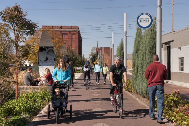 Downtown Indianapolis has been recently transformed by an eight-mile bicycle and pedestrian path that connects five of the city's cultural districts and neighborhoods. The trail passes nearly every major cultural and entertainment venue downtown, including the Indiana State Museum, the Indiana Repertory Theater, and Fountain Square. The unique design elements of the trail include distinctive pavement materials, wayfinding signs, and public art by local artists.