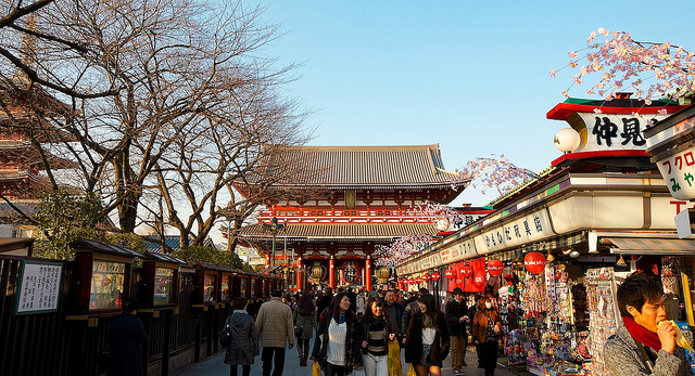 This historic shopping street near Tokyo is characterized by its traditional architecture and proximity to the famous Senso-ji Temple. Merchant stores displaying colorful Japanese goods and artwork are on display even when the stalls are closed, due to artwork on the store’s shutters.