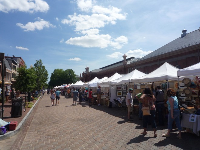 Washington DC’s 7th Street is home to the historic Eastern Market, an important neighborhood anchor. An indoor market during the week, on Saturdays and Sundays the street is closed to vehicles so that the market can expand and use the full right-of-way. A large canopy on the Market Building’s exterior offers shade and rain cover for pedestrians and street vendors. Special pavement across the right-of-way in historic stamp style adds to the charm of this street and serves as a signal to drivers to lower their speeds. Additionally, the street is closed to vehicular traffic for special events throughout the year.