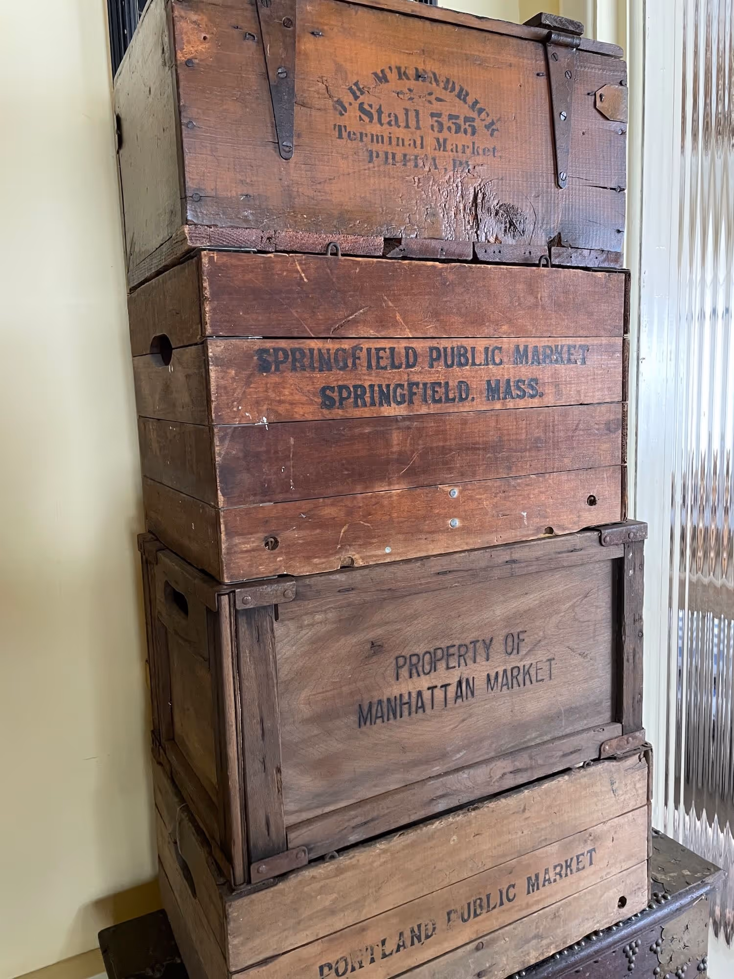 Wooden crates were once common in markets and had many uses. Sturdy enough to haul products to market, they were also used to assemble orders delivered to customers by horse drawn carts, delivery trucks and trains. Most boxes were designed to be collapsible, saving storage space when not in use.