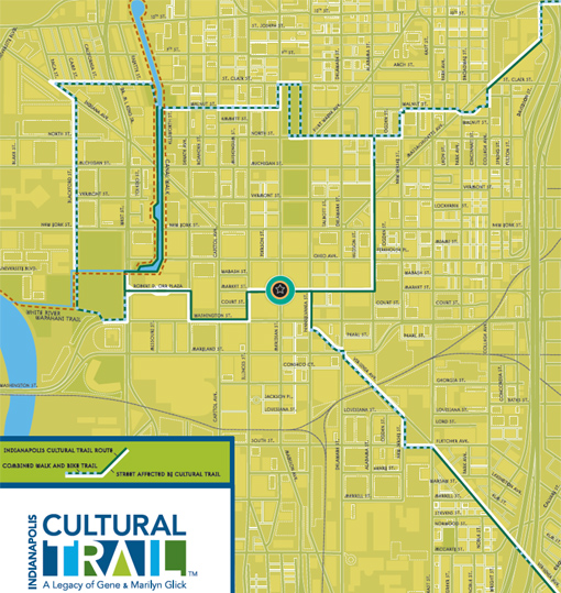 The Indianapolis Cultural Trail, 8 miles of separated greenway, is currently being built through the downtown core of Indianapolis. Led by the Central Indiana Community Foundation in partnership with the city, the project is a bold response to skyrocketing obesity and an opportunity to improve the downtown area.