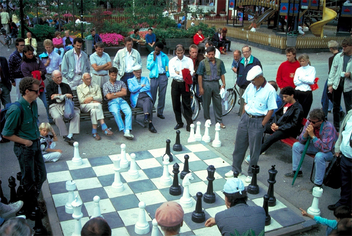 How many different types of activities are occurring - people walking, eating, playing baseball, chess, relaxing, reading?