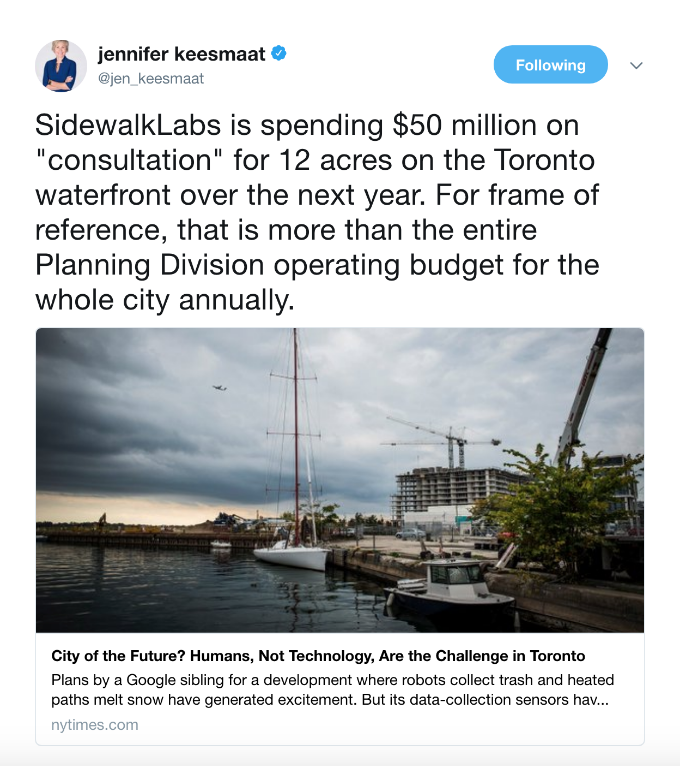 Few details have been released about what this will involve, other than some proposed experiments in transportation and sustainability technology, and a community process resulting in the creation of a final “Master Innovation and Development Plan” (MIDP) for review by their local partner, Waterfront Toronto. But by all accounts, this is a nearly unprecedented amount of money to dedicate to community process. As a point of comparison, former Toronto Planner Jennifer Keesmaat pointed out that Sidewalk Toronto’s $50 million is larger than the annual operating budget of Toronto’s entire Planning Department. The MacArthur Foundation, meanwhile, considers $100 million enough to address a challenge on a global scale.
