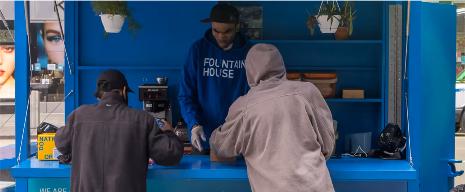 In Times Square, a kiosk called the Recharge Station provides the alibi of charging one's phone or grabbing a cup of coffee, encouraging interactions between New Yorkers, regardless of housing status or mental health needs, while also connecting them with social services. With the aim of building up trust among vulnerable individuals, the Recharge Station kiosk is staffed by members of Fountain House, a nonprofit focused on supporting people impacted by mental illness, as well as a social worker. Visitors can be put in touch with housing and mental health resources, or simply stop by for a refreshment or to use a charger. This sense of choice reduces stigma, and invites people from all walks of life into the same space.