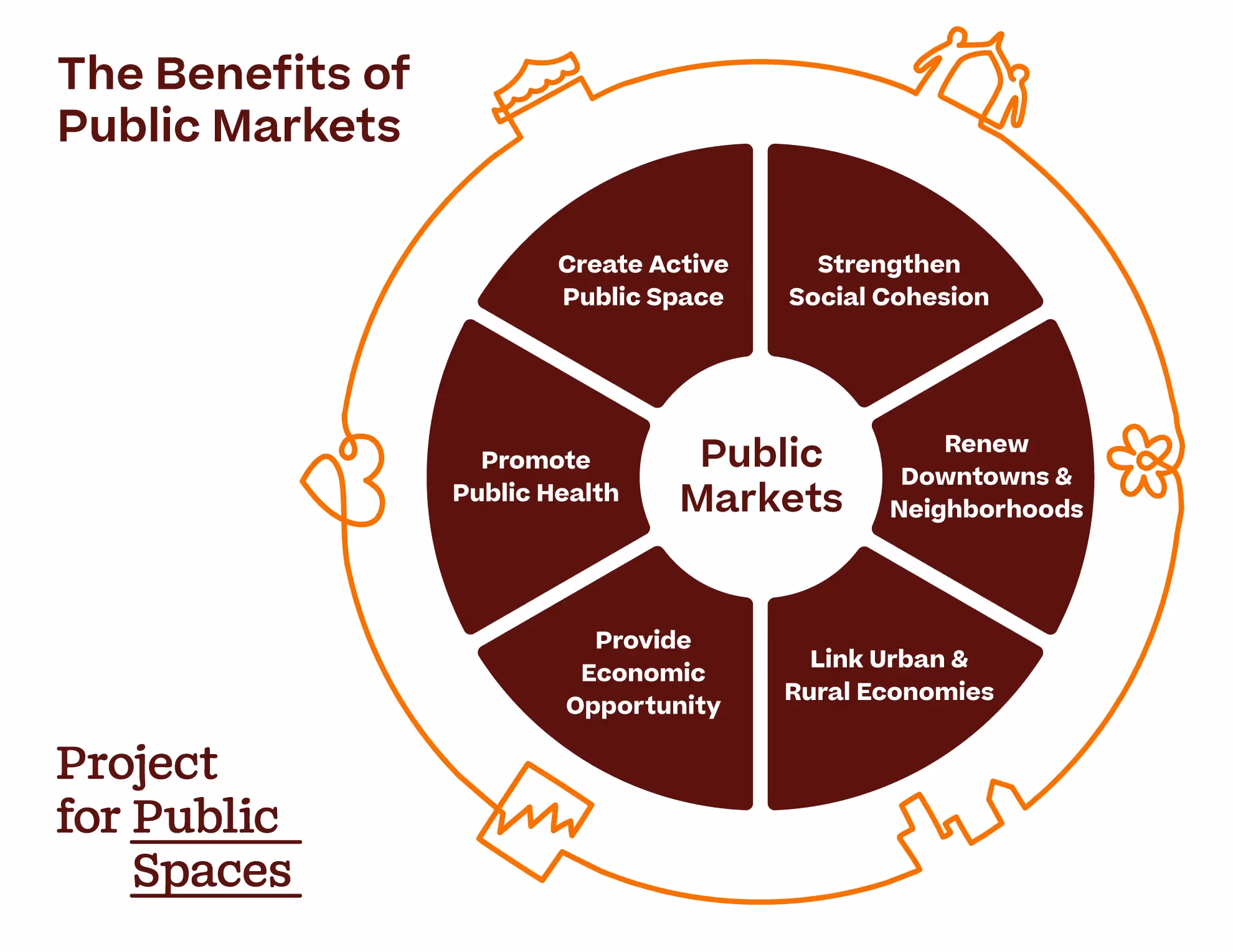 The spin-off benefits of public markets are numerous. From increasing access to fresh, healthy food to providing important revenue streams, markets positively impact local businesses, governments, and residents. But perhaps most importantly, public markets serve as public gathering places for people from different ethnic, cultural, and socioeconomic communities—markets are our neighborhoods’ original civic centers.