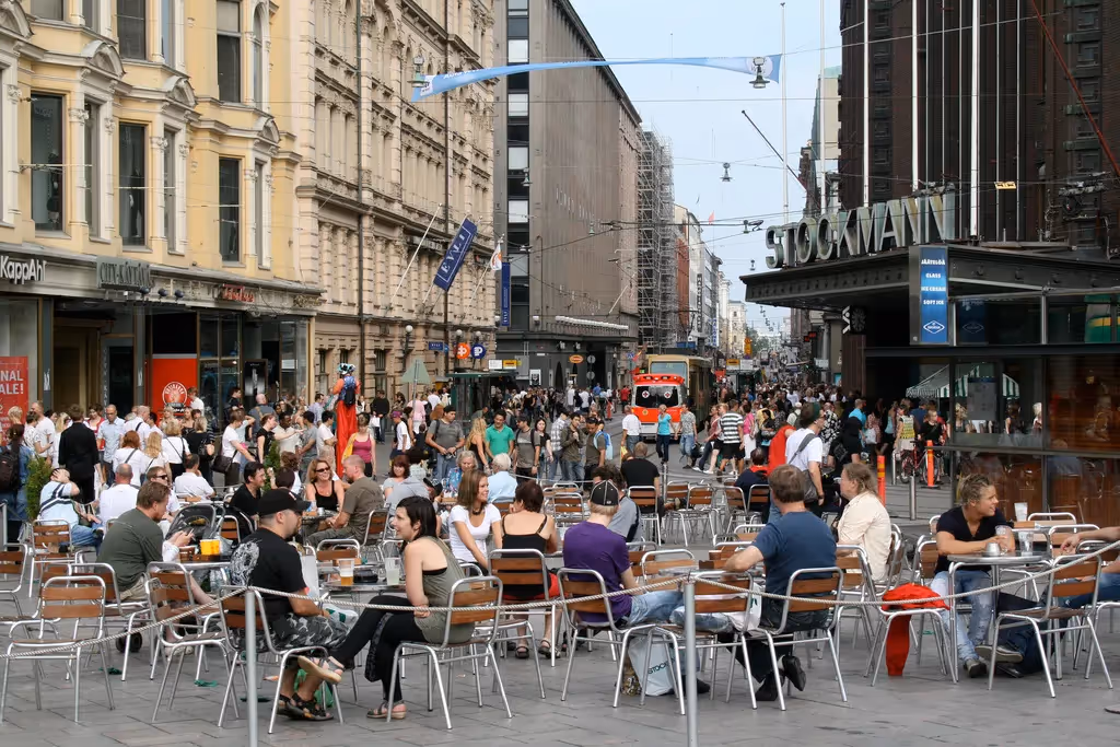 On weekends, Aleksanterinkatu transforms into a vibrant pedestrian street. During this time, only trams and emergency vehicles are allowed access onto the street, which creates a safe and accessible environment for the large crowds visiting the area. Located at the western end of the street, Three Smiths Square--which is filled with movable tables, chairs, and benches-- offers shoppers a welcoming spot for relaxing and mingling.
