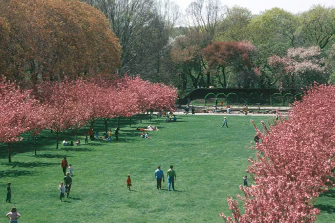Many of the attractions at the 52-acre Brooklyn Botanical Garden run alongside a "main street" of sorts that extends from the Japanese Garden to the Conservatory - a layout that contributes to its success as a public place. This is the busy heart of the gardens, where seasons are marked by the landscape: In the spring, daffodil hill is the first to bloom, then the magnolia trees followed by the dogwoods and tulips, and finally, the water lilies.