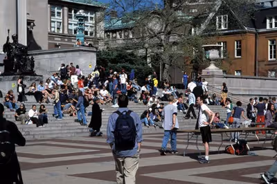 The steps to Columbia University's Low Library (not actually a library) are the heart of the university and in the spring when the weather is good becomes a great hangout. Hundreds of students are outside playing frisbee, eating lunch, etc. The steps face Butler Library and are surrounded by some great Mckim, Mead and White architecture.