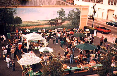 A gentle farmers' market made distinctive by its location: the walls of the parking lot are covered in beautiful full-scale murals of rural farming scenes.