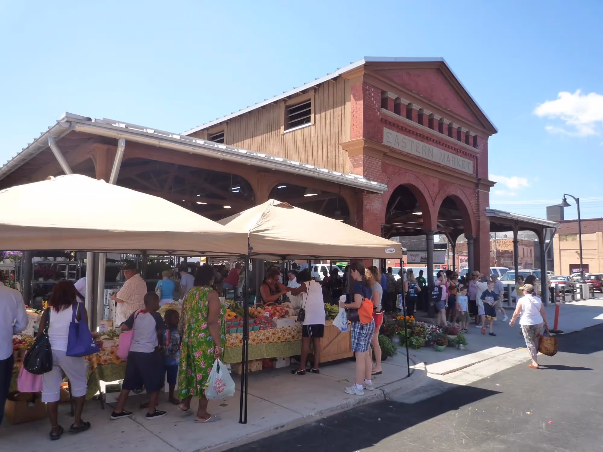Eastern Market is a pedestrian oasis in the middle of a still largely car-focused (but rapidly changing) city. With over 150 vendors in the central market sheds and many other market-related businesses in the surrounding area, Eastern Market has a great variety of places where visitors can find meat, fruits, vegetables, baked goods, jams, honey, apple cider, cheeses, spices, herbs, plants, flowers, and much more. While the wholesale market dominates most of the week, there is also a retail farmers market on Tuesdays and Saturdays and a street market on Sundays. Outside this core, the district also features housing, art space, restaurants, galleries, and other businesses that draw diverse visitors to the area every day of the week. The market is a great source of civic pride for Detroiters--this is exemplified during home games of the Detroit Lions, when many local fans skip the parking lot tailgate scene and head instead to Eastern Market to celebrate the team with friends and fans.