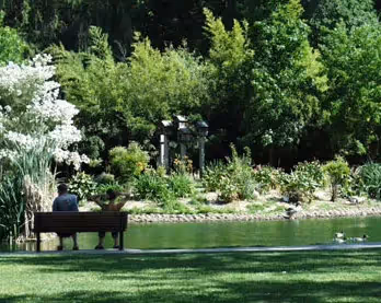 A pre-1950's park with a library and public meeting building, tennis, swimming, basketball, soccer and ball fields, and a play structure. It is so beloved that the neighborhood built the play structure (a unique work of art) with donated materials and labor. It has no parking lot, and is surrounded by a pedestrian-friendly neighborhood.