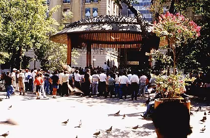 Plaza de Armas is about the size of a small city block with maybe 100 trees and various shrubs, fountains benches but no lawn. The native Chilean palm with it's organic, swoollen trunk rings the perimeter. You can eat there at two or three restaurants with outdoor tables and there is constant entertainment from late morning til early morning. One night their were 12 year old girls dancing in unison, guitar players, stand up comics and you could rent a telescope for about 30 cents American which was pointed at Jupiter and which allowed you to see 4 of it's moons. Another day a seniors brass band was playing while whistle blowing protesters paraded through the centre of the square. They both seemed oblivious to each other. The Mercado Central was designed by Gustave Eiffel and you can count on good coffee there. One Sunday morning I had a strawberry smoothie while almost everyone else was having their last drink of the night with pil pil, hot fried shrimp. The sun poked through small dirty window insisting that everyone end their revellery. But even the dust motes and flies which it caught in it's rays seemed to dance to the guitar player serenading us for 1000 peso notes.