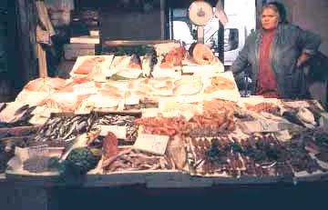 The ambience of the market is very upbeat - there's lots of hubbub with vendors rearranging their displays, huddles of grandmothers in their black scarves gossiping about prices and each other. Here you see the serious domestic cooks nosing around for the most fragrant oranges, brightest-eyed fish or even a pair of new leather shoes. The market booths - mostly metal, enclosed booths that open up for the market and close up at night - are not old but they look beat up from much use. Some vendors sell from tables with no permanent booth or enclosure. The market is known for its produce, but it also has nuts, fish and seafood, and flowers.